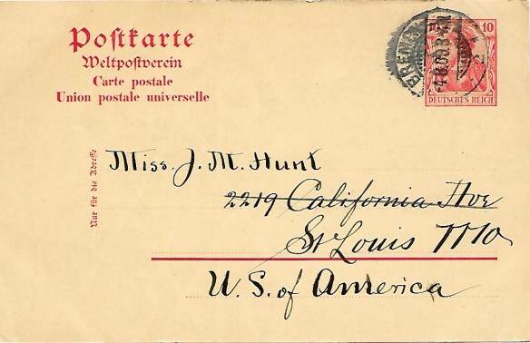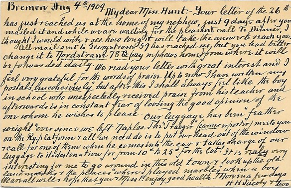 In the evening, we went to Gartner’s for supper. He has a nice home with a large glass covered verandah in the rear. Bremen is still so pretty as of old. Flower gardens in front of the houses, glass covered verandahs and flowers in boxes in from of the windows.