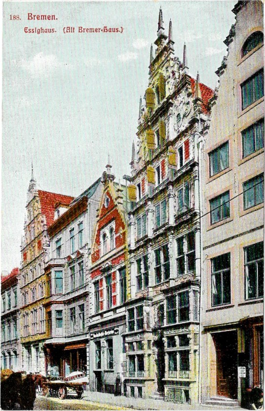“The Essighaus,” erected in 1618, probably according to plans of the architect of the old Rathaus Luder von Bentheim and renovated in 1895, shows in its exterior, as well as in the interior, the true picture of a home of an old Bremen Patrician of the 17th century, including the old merchandise floor where, in week days, the merchandise was stored to be hoisted to the higher floors and which was cleared on Saturday to serve as a reception room of the family. To the right the Hantohr (offices). In the center of the house. the kitchen with its old Dutch tiling.
