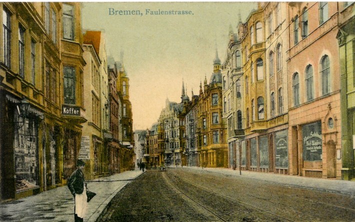 From here, past the new Kaiserbrucke to the Hohe Strasse, where Father lived in 1850 and where I was born and through the Tiefer across the Grosse Weser Brucke, past the Theerhof, a strip of land separating the Grosse Weser from the Kleine Weser, on which Old Bremen is represented by old warehouses, unchanged, just as of old, and across the Kleine Weserbrucke into the Neusradt.