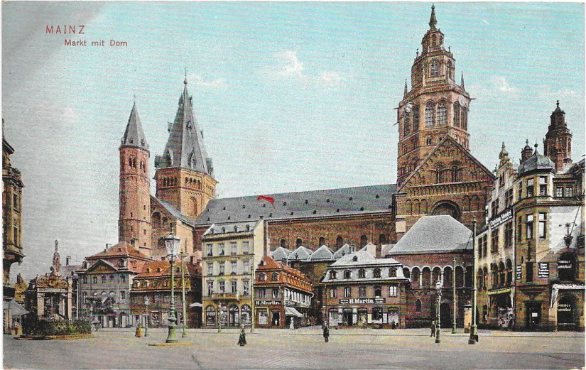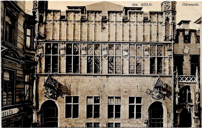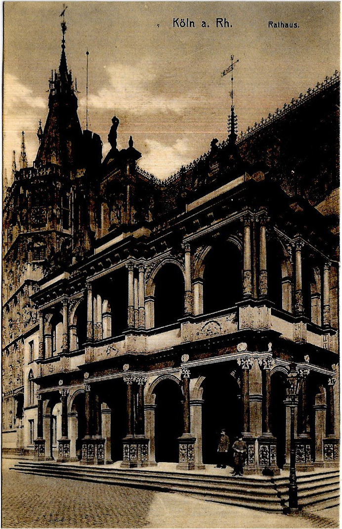 We went shopping this morning and visited the Rathaus. This fine old building was erected in 1405 and has a beautiful facade resting on 12 Doric Columns with a richly decorated oriel window and a very handsome gable. There are 16 statues between the windows representing saints, philosophers and the Emperor and Electors. In front of the portal, toward the Dome, are two armour clad Knights on horseback, executed in chased copper which had been added lately.