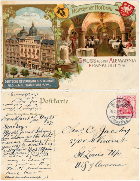 She lives in the old house upstairs, and we had to climb the same old narrow steps which have been there for generations. Down stairs we saw her son, Charles Foucard, and his wife Alice, who is the daughter of Jean Achard and his wife, Tante Charlotte. We called on Louis and Clement Achard (the sons of Uncle Louis), who own a large factory for making the celebrated Friedrichsdorfer “Zwieback” which is shipped by them into all parts of the world. They inquired especially after John and Hermann Achard.