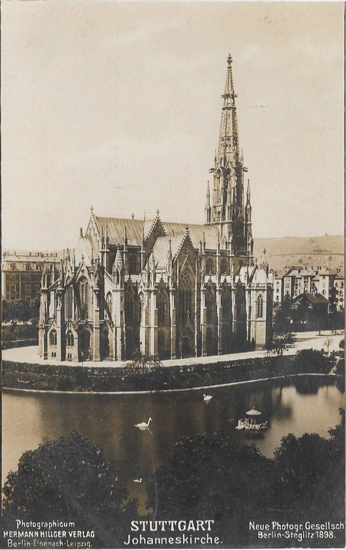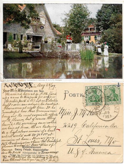 We went to meeting and had an excellent dinner consisting of Goose, Sauerkraut and Bacon, a fine dish. We then made the usual rubber necking trip and passed on our road the fountain “Hans im Gluck”; the Rathaus; Stifts Kirche; St. John’s Church, situated on a peninsula formed by the Fewersee; also the Garnisons Kirche; the Gewerbe Museum; and the spot on which formerly the Court Theatre was located. This burnt down and, in its place, they have laid out a pretty garden, the Schloss Garten, a charming pleasure ground with fine groups of trees, flower beds, and sheets of water. It is 200 acres in area and is adorned with marble statues, among them Count Eberhard resting in the lap of a Shepherd, alluding to Urland’s pretty poem in which he says that “Er sein Haupt getrost Kann legen en dem Untertan im Schloss.”