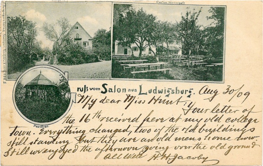 I am so anxious to see my old college that we concluded to go to Ludwigsburg this morning. We reached it in 1/2 hour by rail and went to the hotel where I found a letter from Armine in which she informed me that she has sent three more in care of the German Preacher Rev. Reber, so we walked to his home.