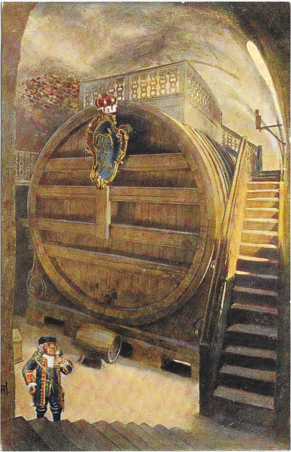 [text on back] The great Heidelberger barrel. The figure is Perkeo, a court jester of whom it was said “Perkeo was small, but his thirst was large.”