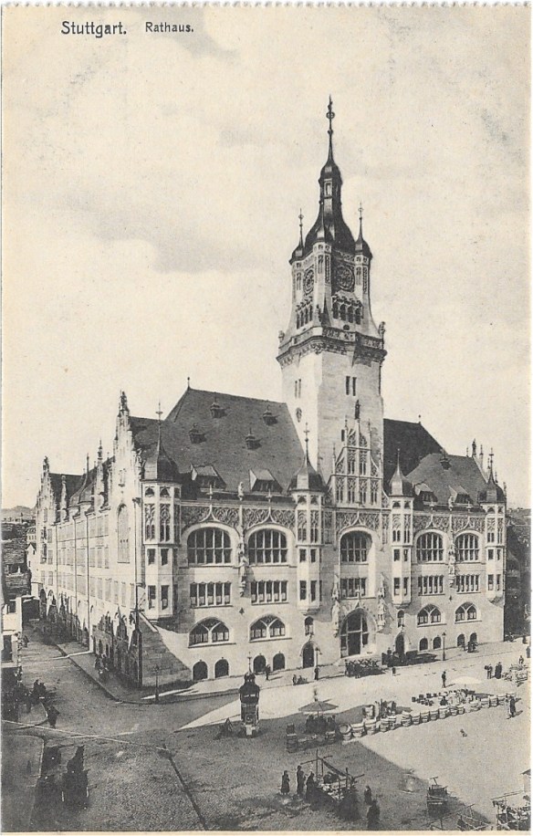 We passed through many old streets where every other house seemed to be a Gasthaus (tavern) with all kinds of funny signs such as Lowe, Affe, Schluessel, etc., past the pretty gothic church St. Leonhard and the old Wachter Brunen and to the Market Place, the center of old Stuttgart, with a few patrician houses of the 16th century, and the beautiful New Rathaus. We also saw the part of the city where the old houses have been torn down and replaced by new ones in a style which is in keeping with the old ones near by.